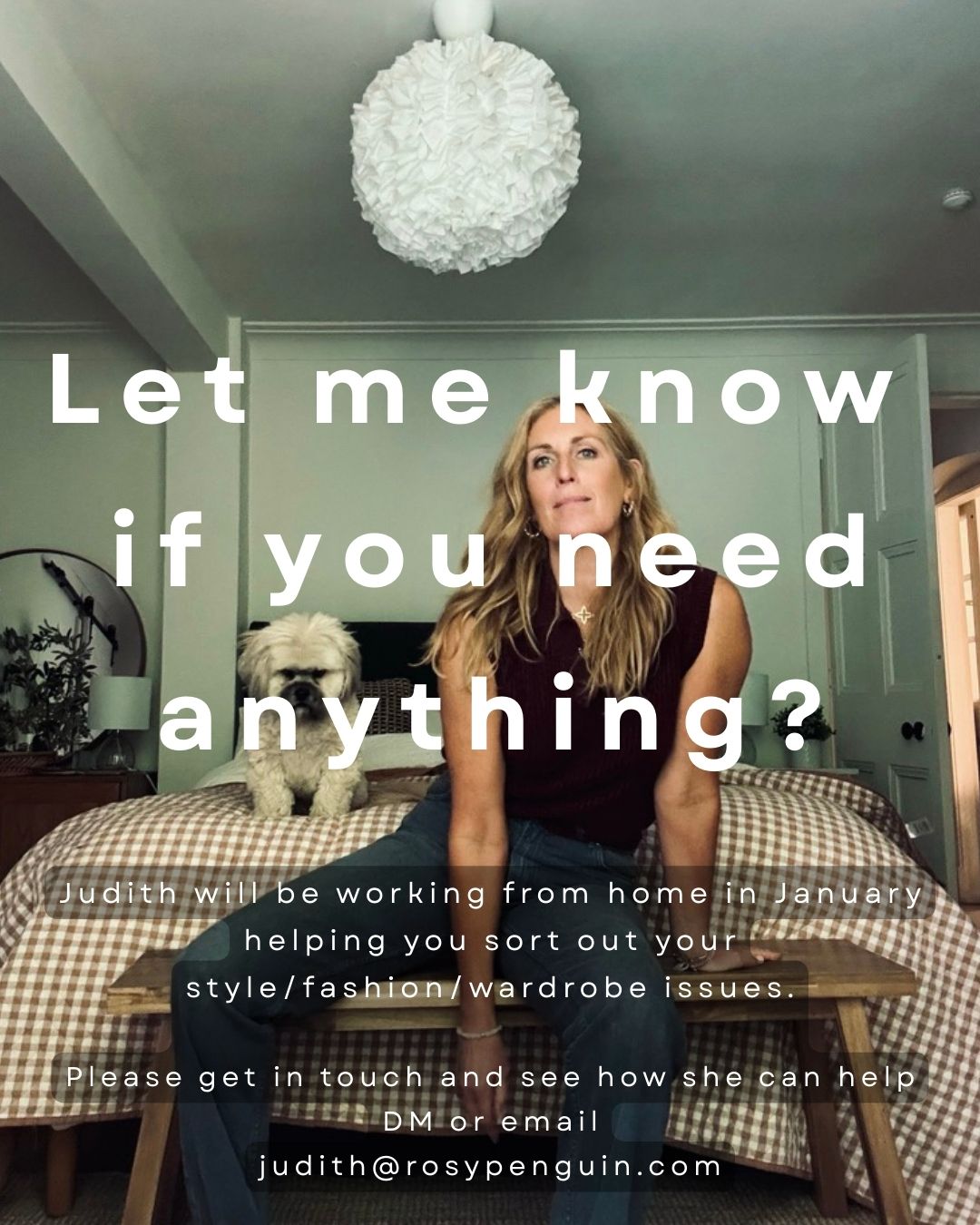Judith is working from home (or your home!) in January, offering you the opportunity to get your style sorted for the year ahead. Get in touch with Judith and see how she can help you. Wardrobe sort outs, style advice, colour or makeup advice. Reach out and see what happens next.