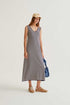 Long dress in navy and white striped knit fabric. V-neck and sleeveless. Flowy fit. Ribbed trim details. The model is 177 cm tall and wears size S.